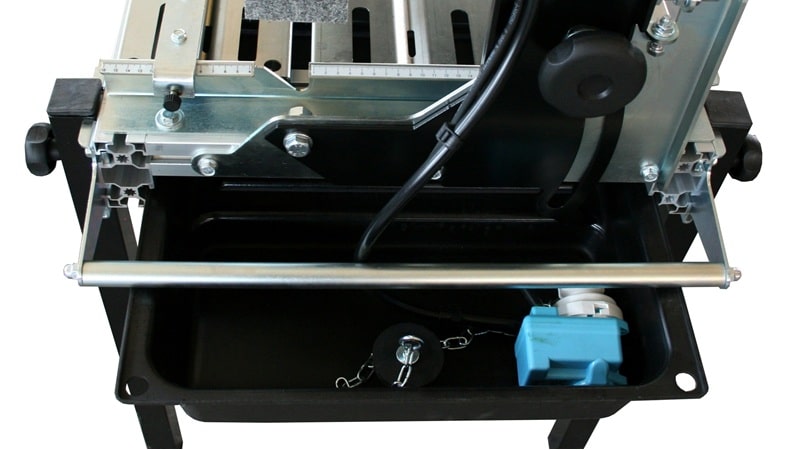 Worktable made of galvanized steel rails, with built-in handles and service square. Removable ABS water tank, impact- and wear-resistant, easy to clean and designed with a sludge separation area. Built-in recycling pump included for blade cooling during cutting.