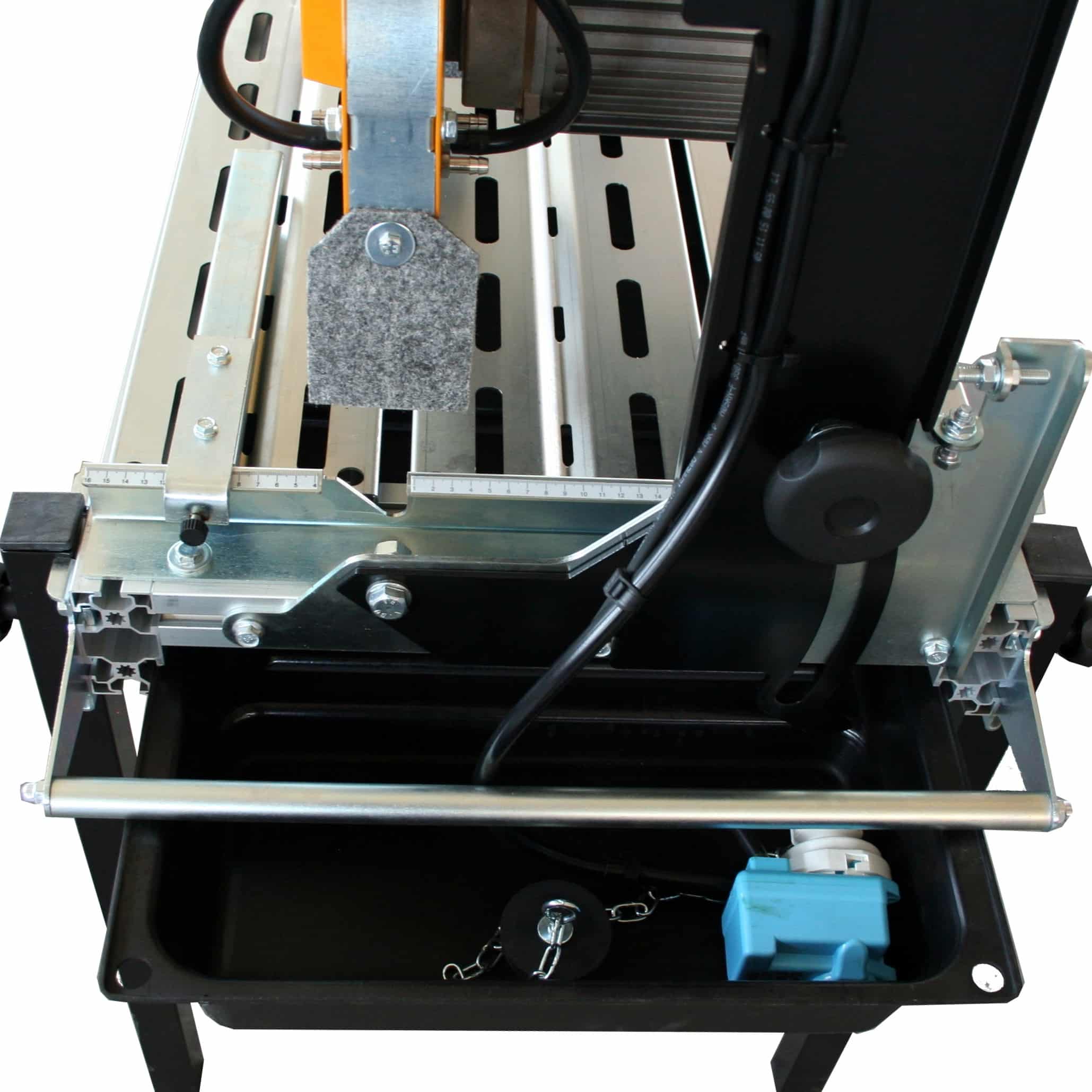 Worktable made of galvanized steel rails, with built-in handles and service square. Removable ABS water tank, impact- and wear-resistant, easy to clean and designed with a sludge separation area. Built-in recycling pump included for blade cooling during cutting.