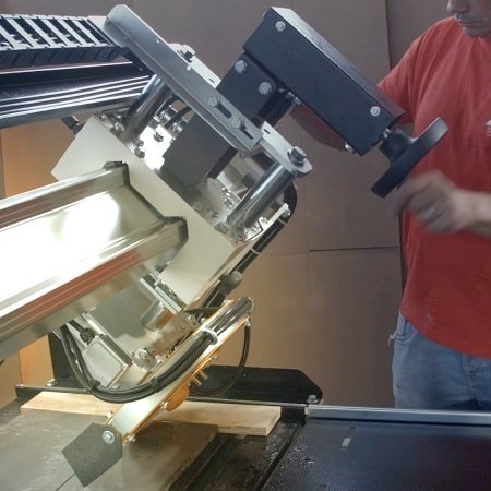 Manual bridge tilt for cutting from 90 to 45 degrees.