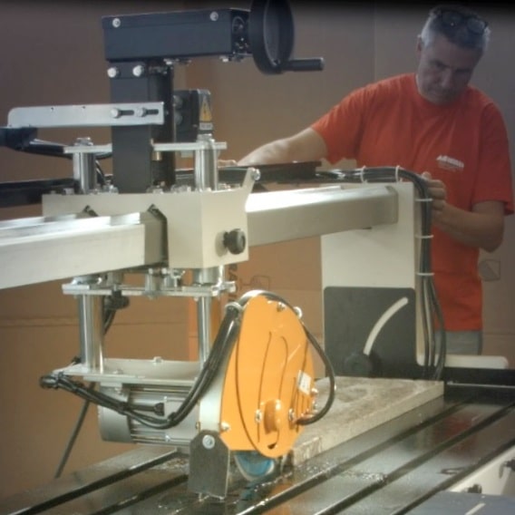 Compact, essential and sturdy saw with fixed bridge and manual head feed for marble and granite slabs; the bridge tilts and the water tank with built-in recycling pump makes it the perfect for small and large stone fabrication shops. It is equipped with 1 or 2 side extension tables to enlarge the working surface and facilitate the positioning of the slabs