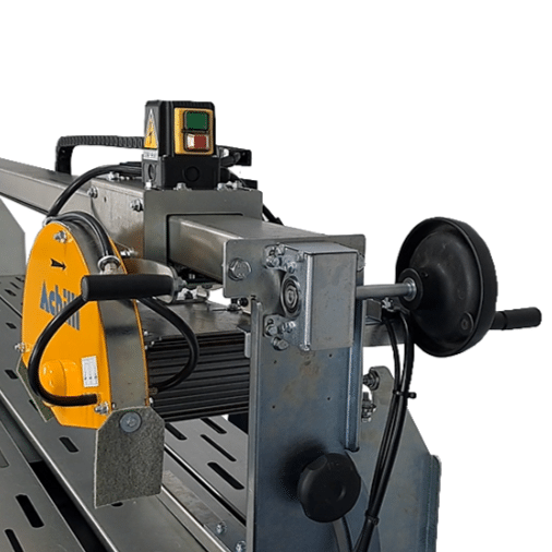 Worktable made of galvanized steel rails, with built-in handles and service square. Removable ABS water tank, impact- and wear-resistant, easy to clean and designed with a sludge separation area. Built-in recycling pump included for blade cooling during cutting.