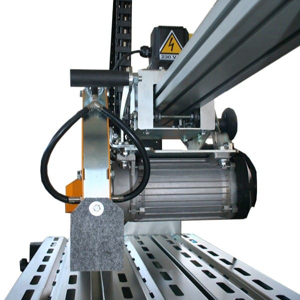 Worktable made of galvanized steel rails, with built-in handles and service square. Removable ABS water tank, impact- and wear-resistant, easy to clean and designed with a sludge separation area. Built-in recycling pump included for blade cooling during cutting.
