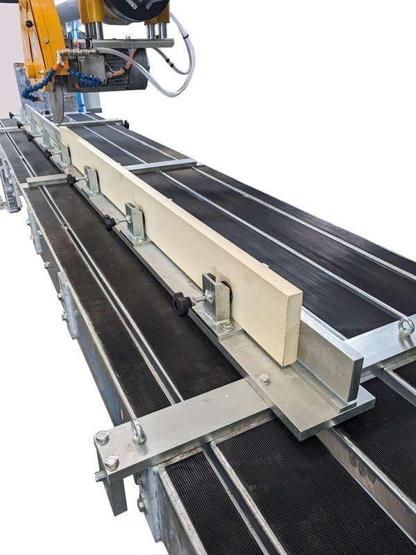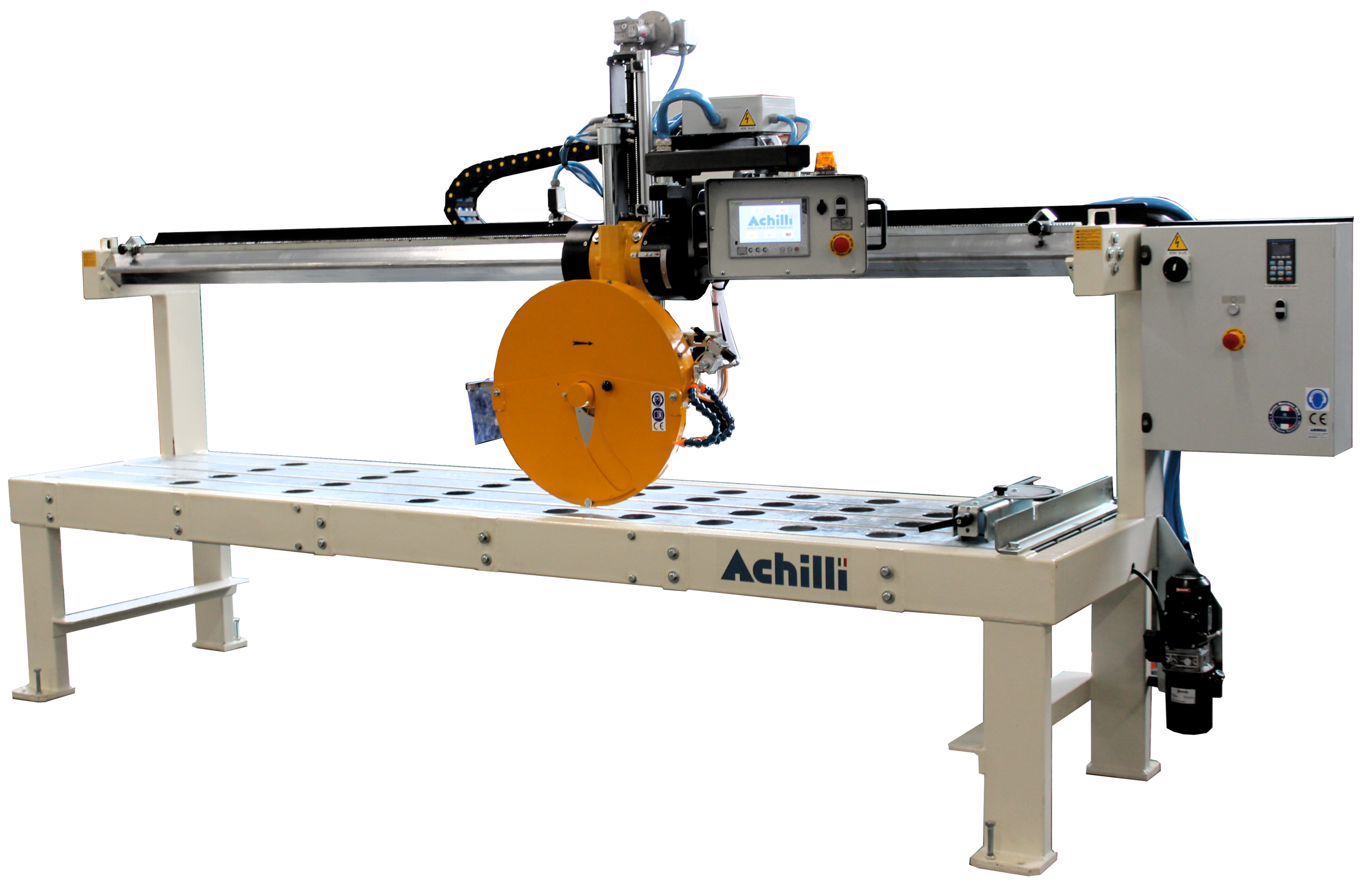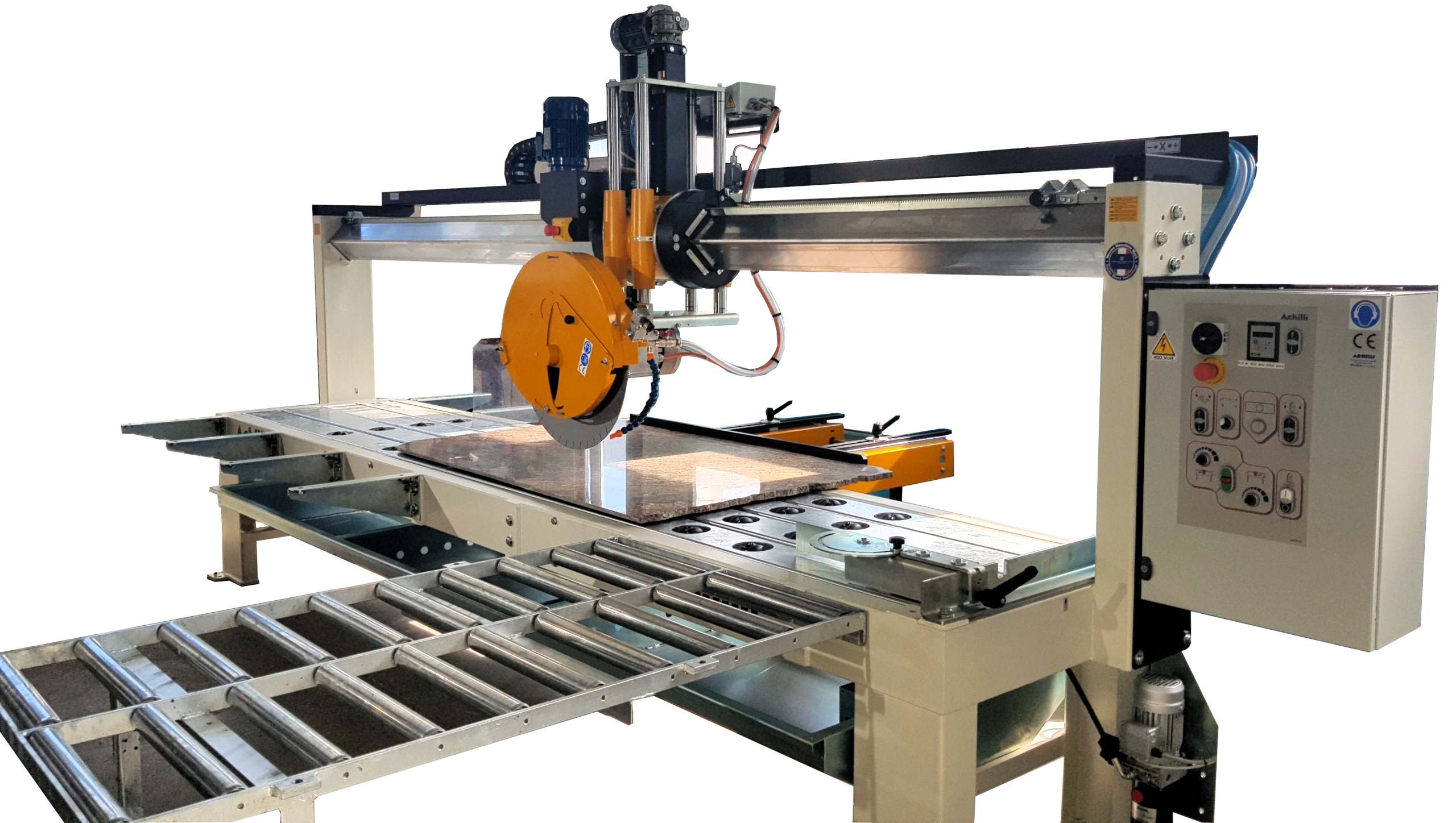 Stone saw with fixed bridge for stone, quartz and ceramic slabs Monoblock saw with fixed bridge for stone and sintered material slabs equipped with a compressed, rectified and chromed “active beam” guaranteeing the utmost accuracy. The worktable extensions widen the worktable facilitating the positioning of large slabs and the head feed is motorized with variable speed adjustment in both directions.